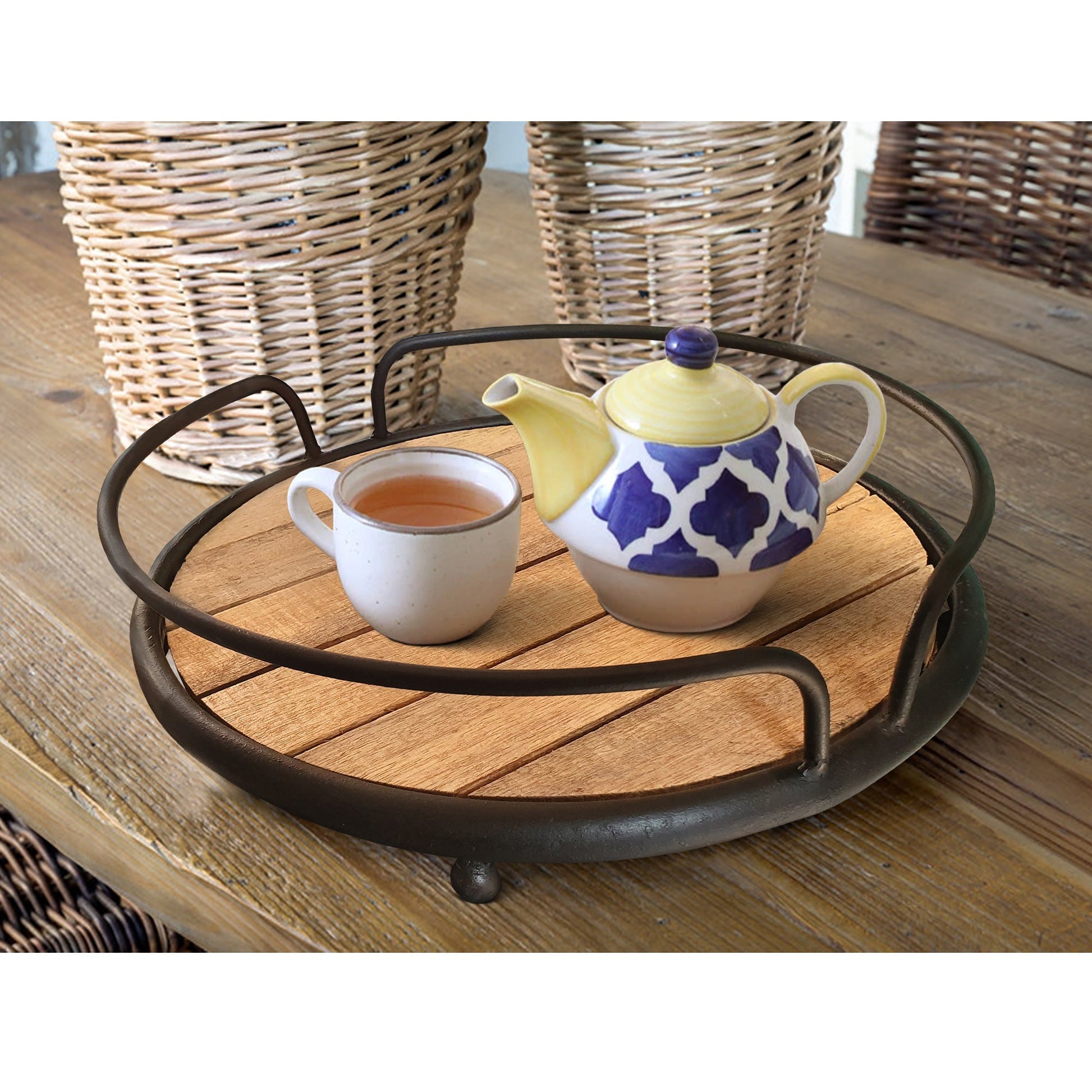 Bring countryside flair into your home with this rustic style round serving tray, featuring a plank style wooden base in a brown finish that perfectly contrasts with the antiqued black finish metal frame. Durably constructed, this tray is incorporated with metal side rails that double as carrying handles and supported on 4 round feet that offer stability. This tray makes a great decorative accent to hold your beverages and adds a rustic charm to any tabletop. Incorporated with metal side rails that double as carrying handles.